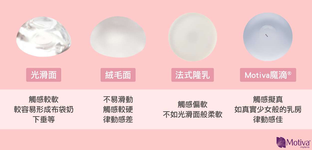 Motiva魔滴®:觸感擬真,標榜如真實少女般的乳房,慢慢恢復後會越來越軟,且由於Motiva魔滴®將4D流動膠體融合在隆乳材質上,因此律動感較佳。