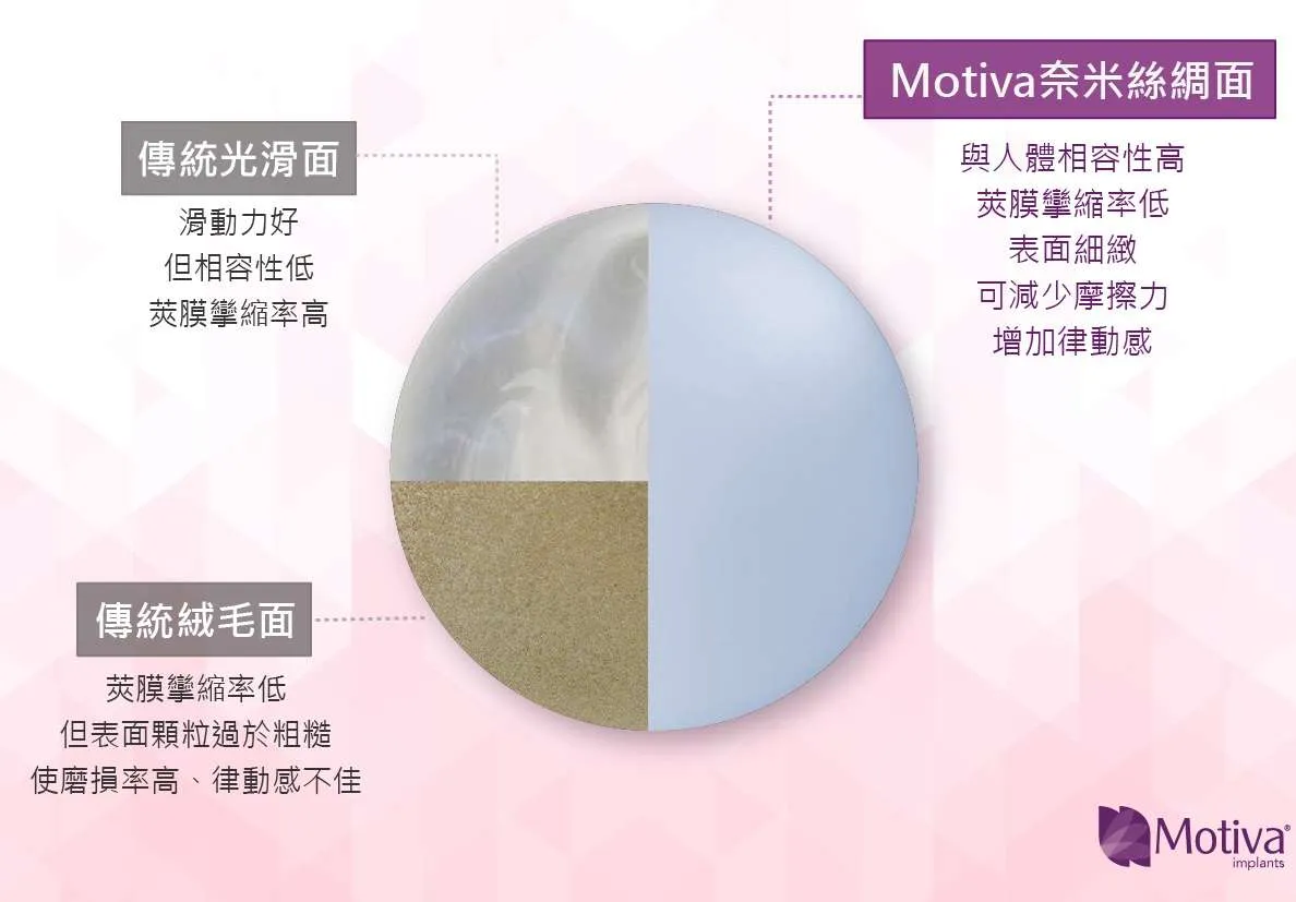 而Motiva魔滴®奈米絲綢面,其外膜細緻的紋理,改良了光滑面與絨毛面,讓身體可以更快速、更容易適應,術後不但不需要如光滑面進行按摩,也不易有絨毛面過度摩擦的問題,可以說是為乳房植入物添上嶄新的一頁。