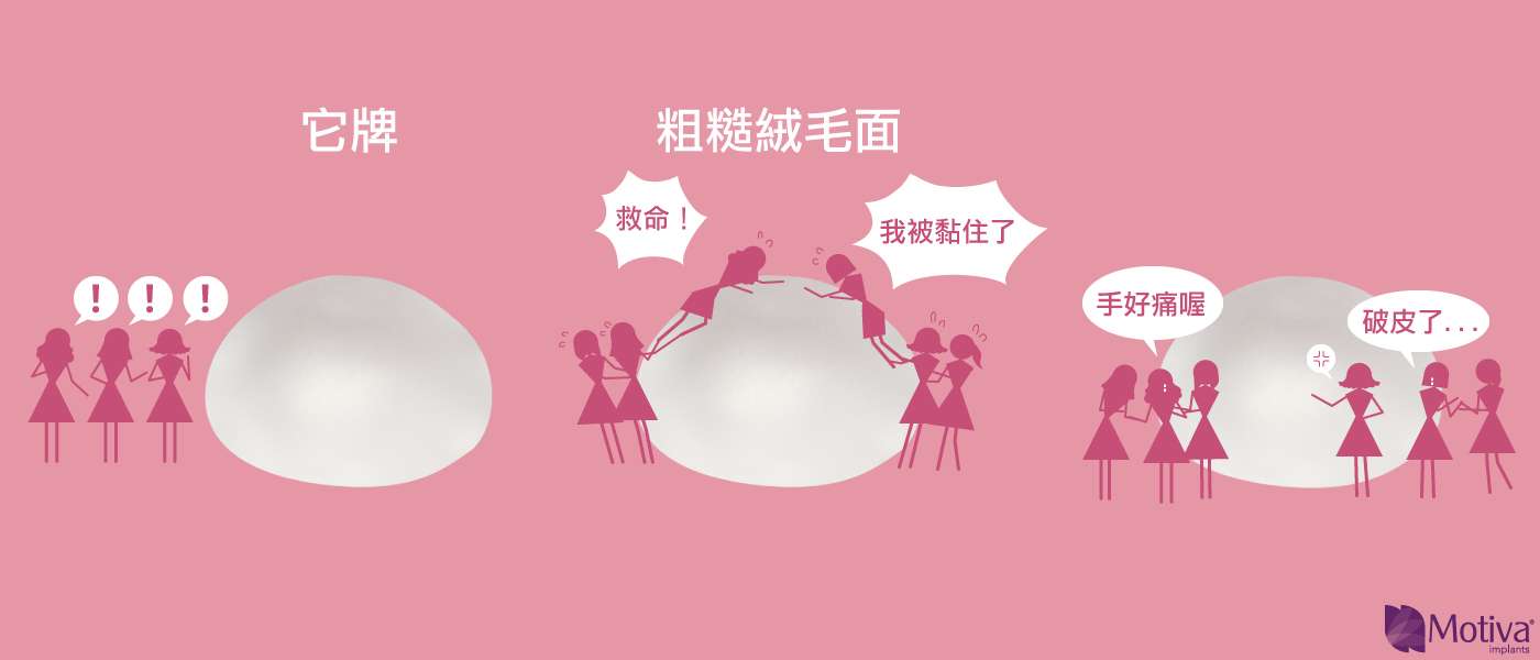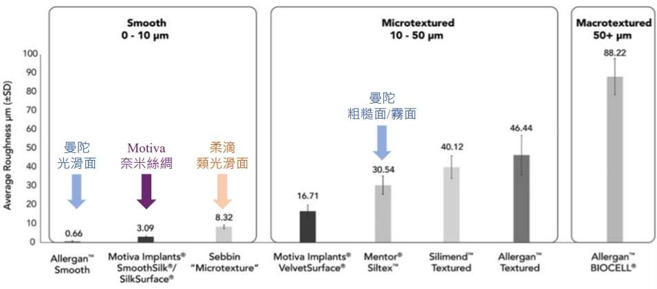 目前市面上乳房植入物的表面粗糙度為 絨毛面>法式隆乳(類光滑面)> Motiva魔滴® (奈米絲綢面)>光滑面。