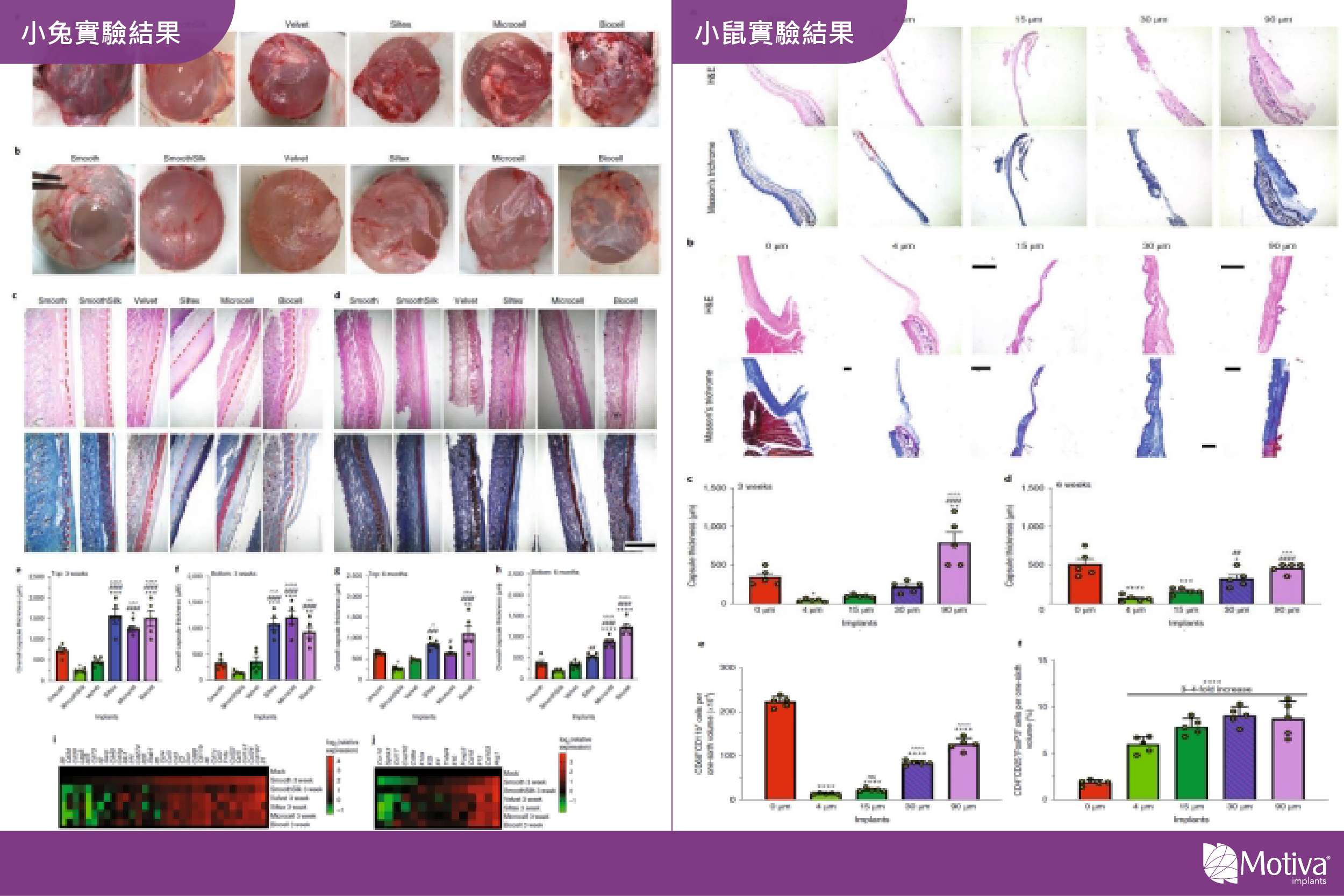而研究結果顯示,小鼠及兔子的實驗結果相似,Motiva魔滴®奈米絲綢面形成的莢膜最薄、近乎透明。人類檢體的結果也與動物實驗一致,Motiva魔滴®奈米絲綢面有著較薄的莢膜厚度。