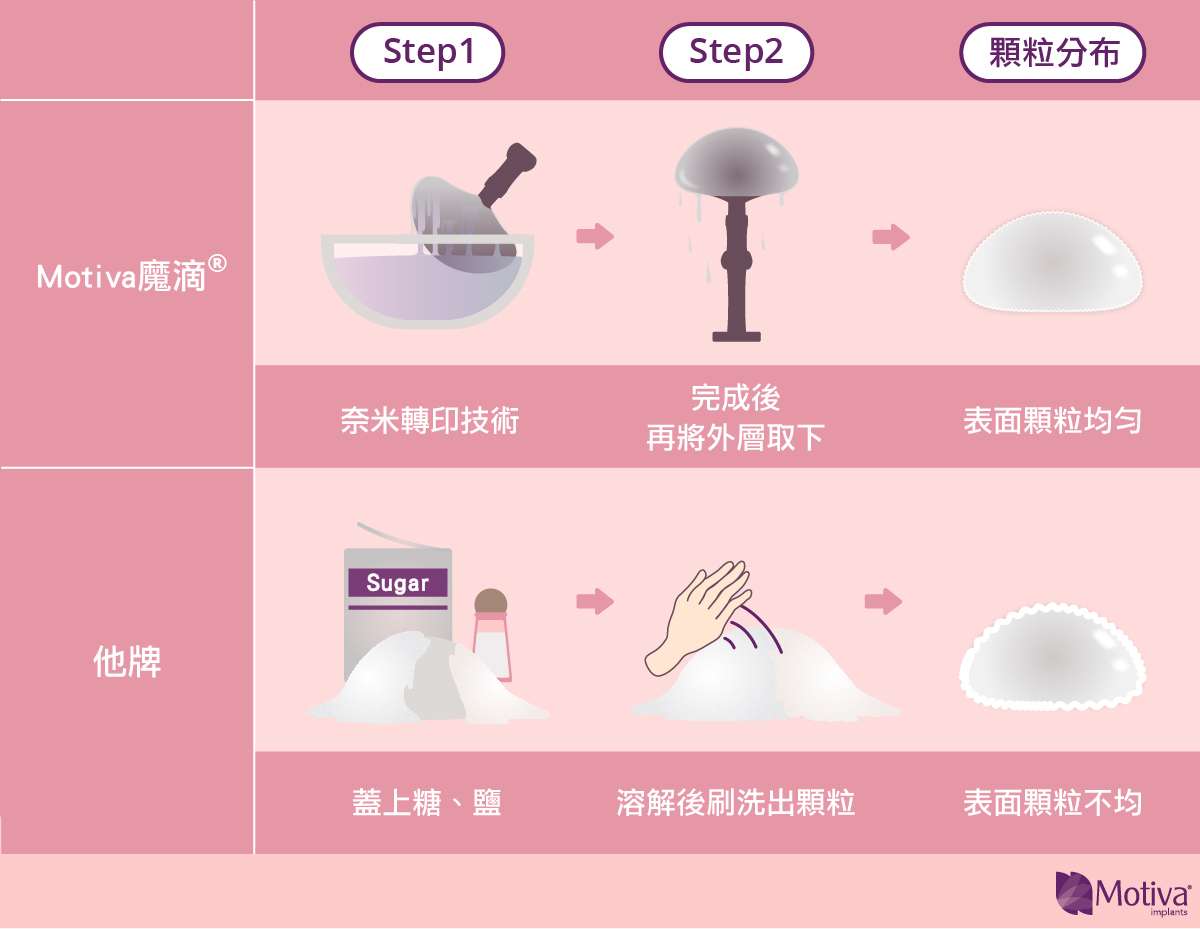 這是由於Motiva魔滴®使用的是3D inversion™ 3D反轉外膜製造技術,將轉印技術用於乳房植入物表面,讓表面的細緻顆粒能達成均質。而若是使用常見的做法將糖或鹽直接蓋上植入物表面,再甩下這些糖粒及鹽粒,因此容易導致表面顆粒分布不均的狀況產生。