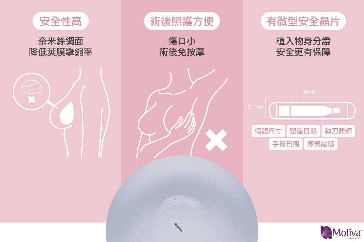 魔滴Motiva隆乳採用別於各家的奈米絲綢面,運用的是特殊轉印技術製作,它擁有細緻的表面,生物相容性高,進而可以降低莢膜的增厚以及莢膜攣縮率,術後也就可以維持原本的自然觸感,也因為莢膜攣縮率低,因此無須術後按摩也能保有原本的柔軟觸感。