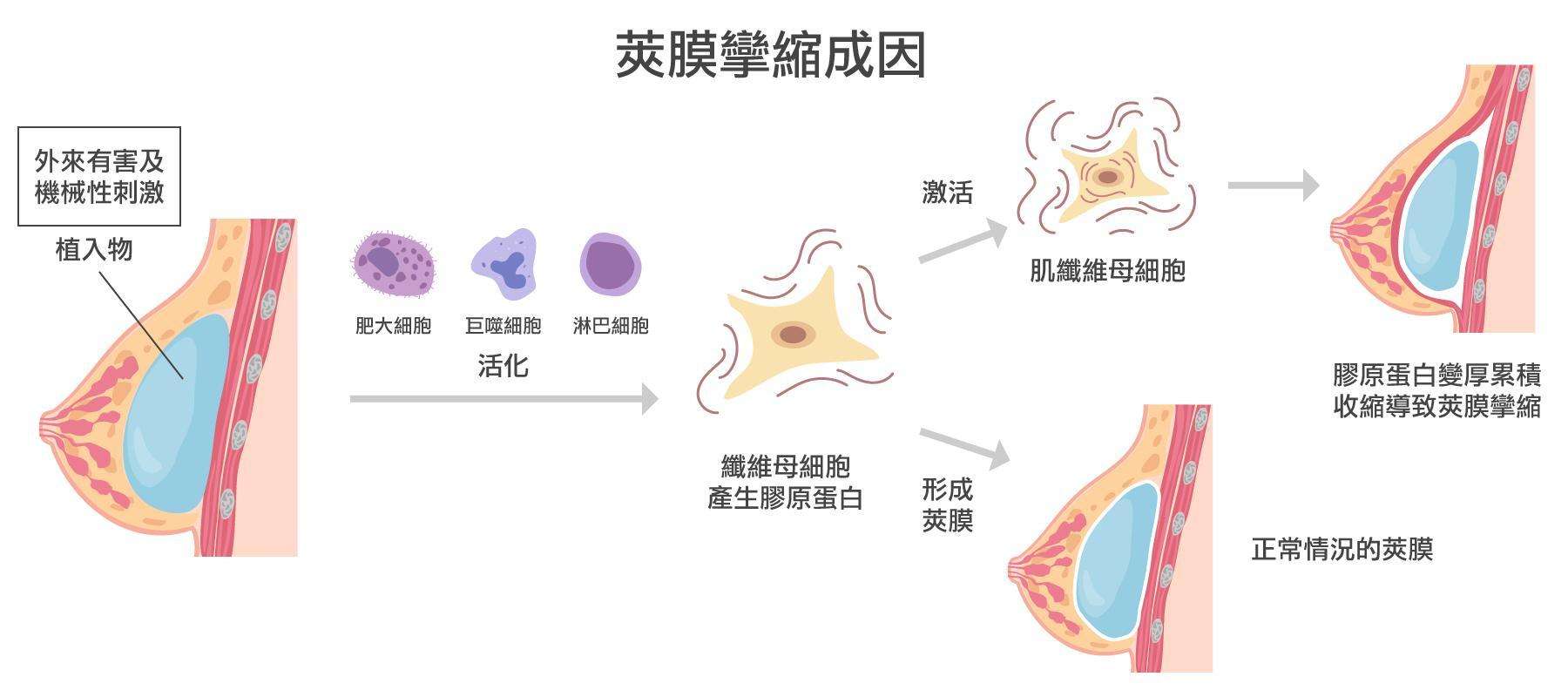 莢膜的產生剛開始是薄薄的一層,但因為填充植入物的材質不同,有些材質如傳統光滑面、光滑女王波等,表面太過光滑,與人體組織相容性差,隨著時間的流逝,術後照護沒有做好,身體的保護機制不斷產生增厚的莢膜,觸感就會與術前有所差異,且甚至變得又硬又推不動,也就是俗稱的石頭奶,最終就會變成莢膜攣縮,產生不美觀也不自然的乳房。