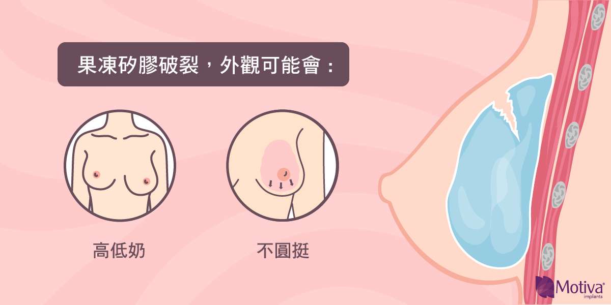 當隆乳材質不慎破裂,可能會造成外觀變形、視覺上的不美觀;也可能因為膠體滲漏導致需要開刀取出;更嚴重者,甚至有可能會因為膠體在體內流動,造成健康上的危害!
