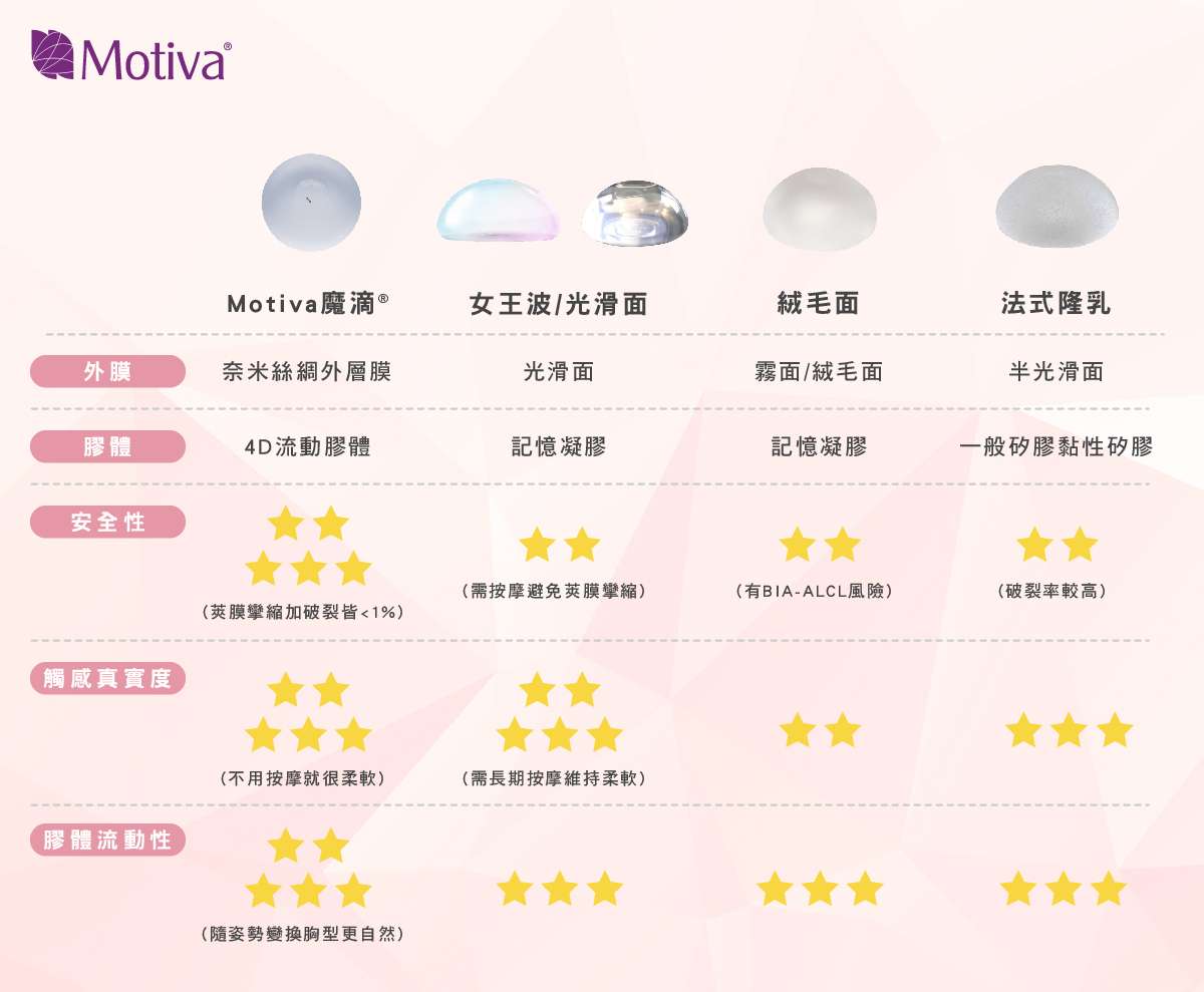 Motiva魔滴®的莢膜攣縮率及破裂率皆<1%,可以說是目前市面上隆乳材質中安全性最高的隆乳材質。