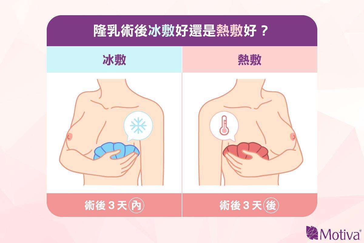 一般來說,隆乳術後的前三天,會建議大家用冰袋來冰敷以減少出血、降低疼痛及腫脹症狀;隆乳手術三天後,再進行「溫熱」敷,促進血液循環與新陳代謝,幫助消腫、減少疼痛感。