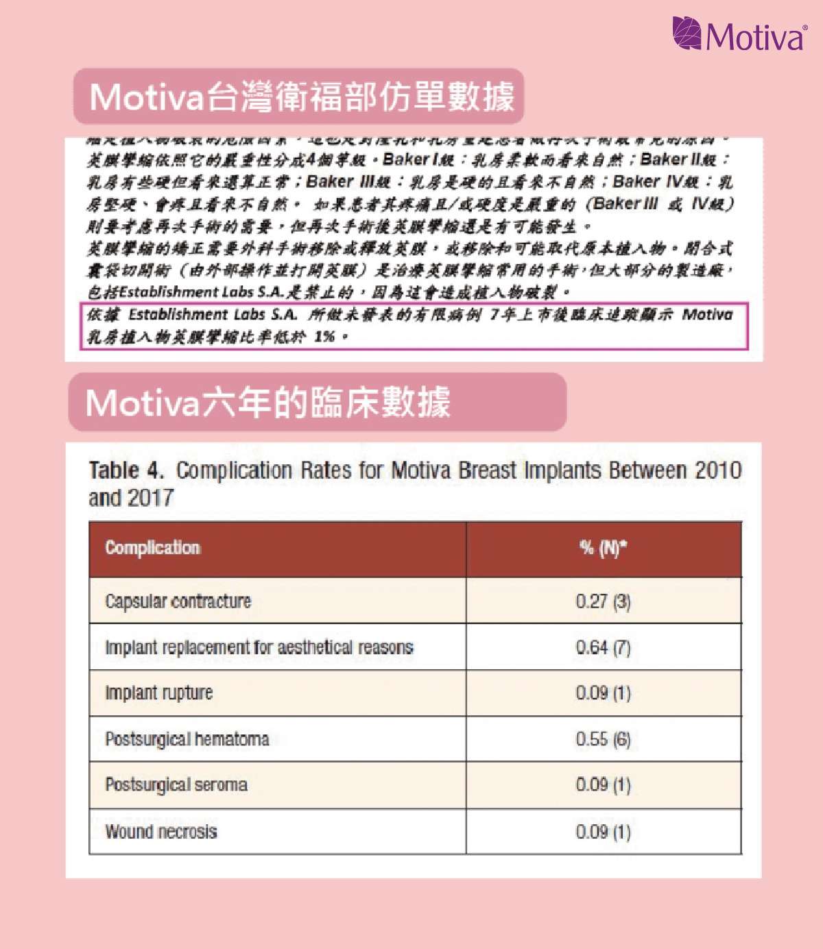 Motiva魔滴®更為台灣衛福部真正核可莢膜攣縮率<1%之乳房植入物,安全性遠遠高於他牌隆乳材質。