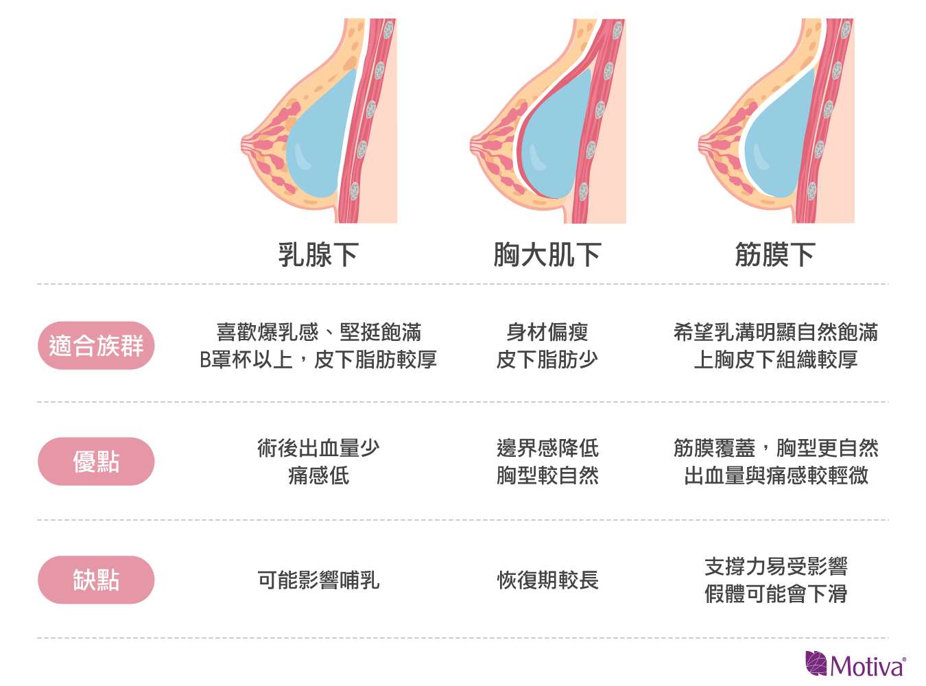 • 胸大肌下:推薦身材偏瘦、上胸皮下脂肪較薄的人,優點是胸型自然,胸部邊界感覺較不明顯。