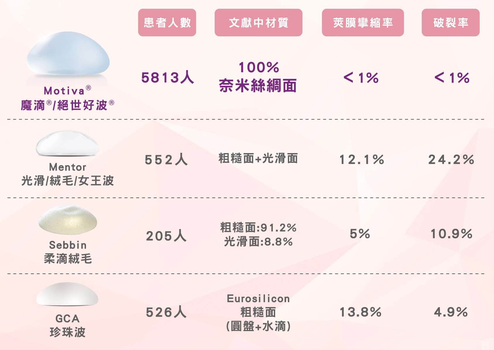 圖說(根據衛福部仿單顯示,曼陀女王波與光滑面的莢膜攣縮率為12.1%;柔滴的術後破裂率達10.9%、莢膜攣縮率則為5.0%;只有魔滴,真正做到莢膜攣縮率<1%!)